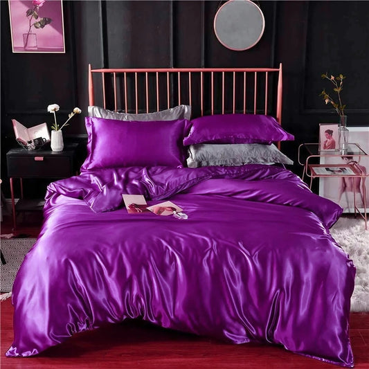 Double Silky Satin Sheet Quilt Cover Pillowcase Bed Set Purple