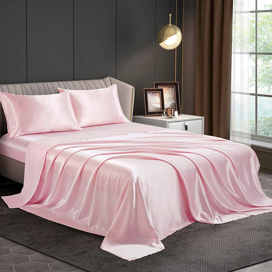 King Size Silky Satin Bed Sheet Set 4-Piece Soft and Smooth Pink