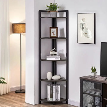 5 Tier Wood and Steel Corner Shelf Organizer Unit (Rustic Grey)