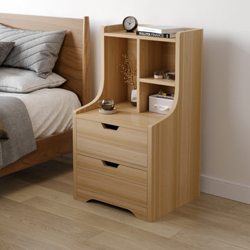 Elegant Tall Oak Bedside Table with Drawers and Shelves for Bedroom