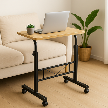 Transform your living room, bedroom or home office into a versatile haven with this beautifully crafted height adjustable side table. Combining the warmth of a rustic oak-grain top with sleek black steel and contemporary geometric braces, it melds farmhouse charm with modern minimalism. Whether you’re working from the couch, studying in bed or savouring a snack, the smooth-rolling castors let you reposition it in seconds.