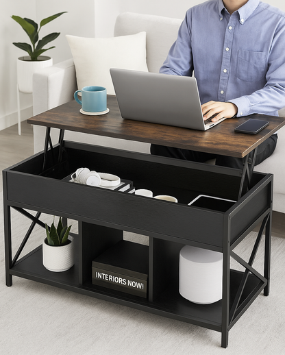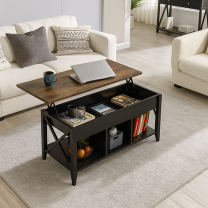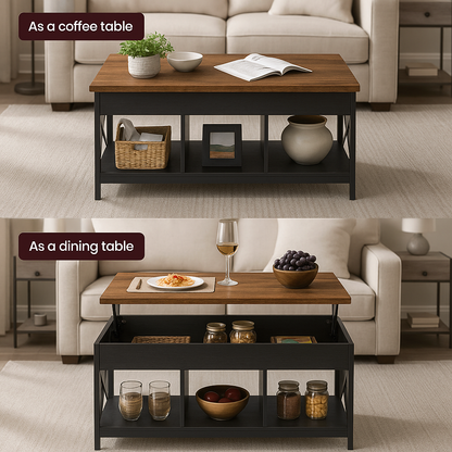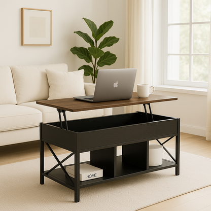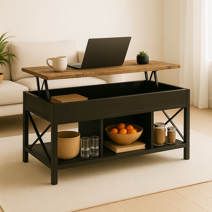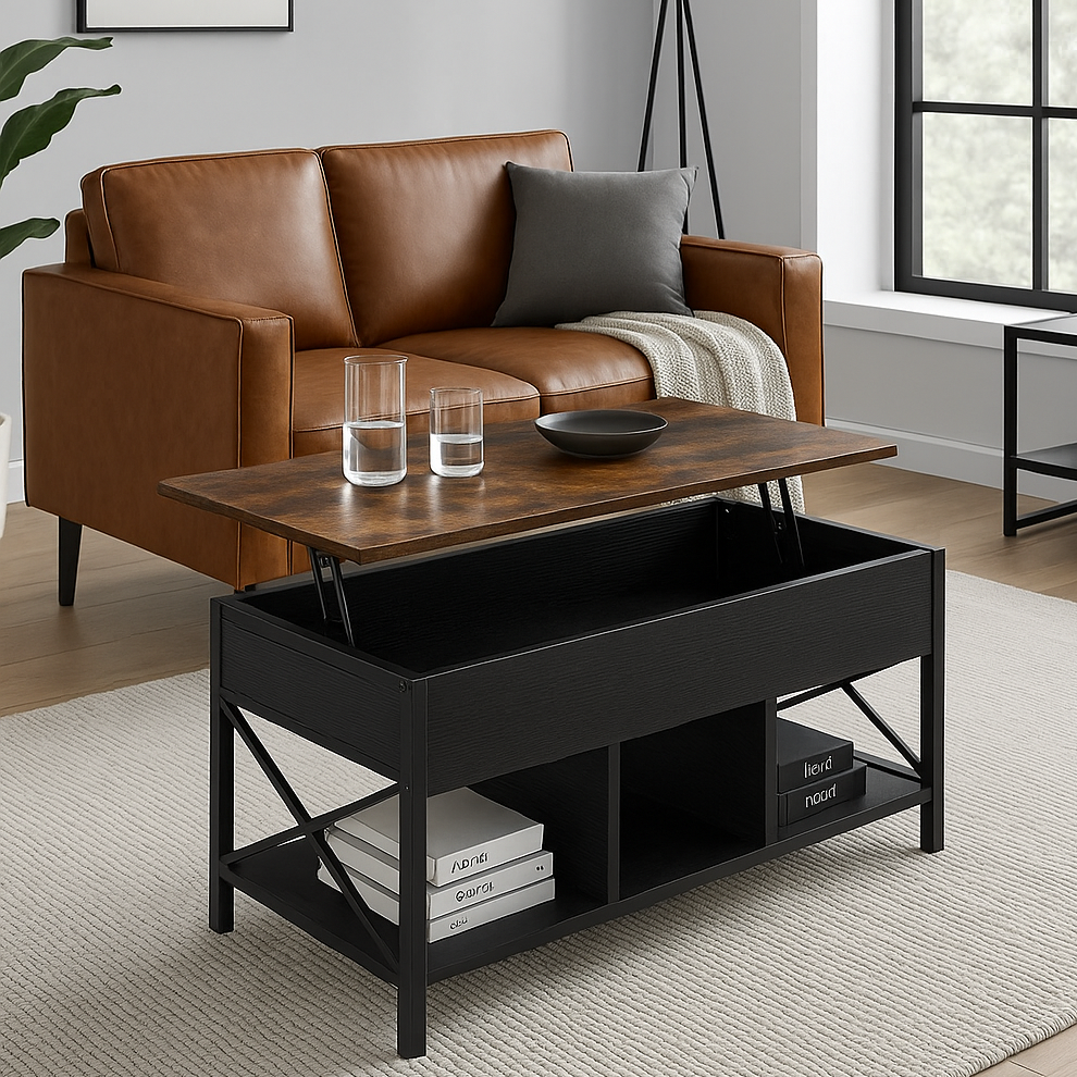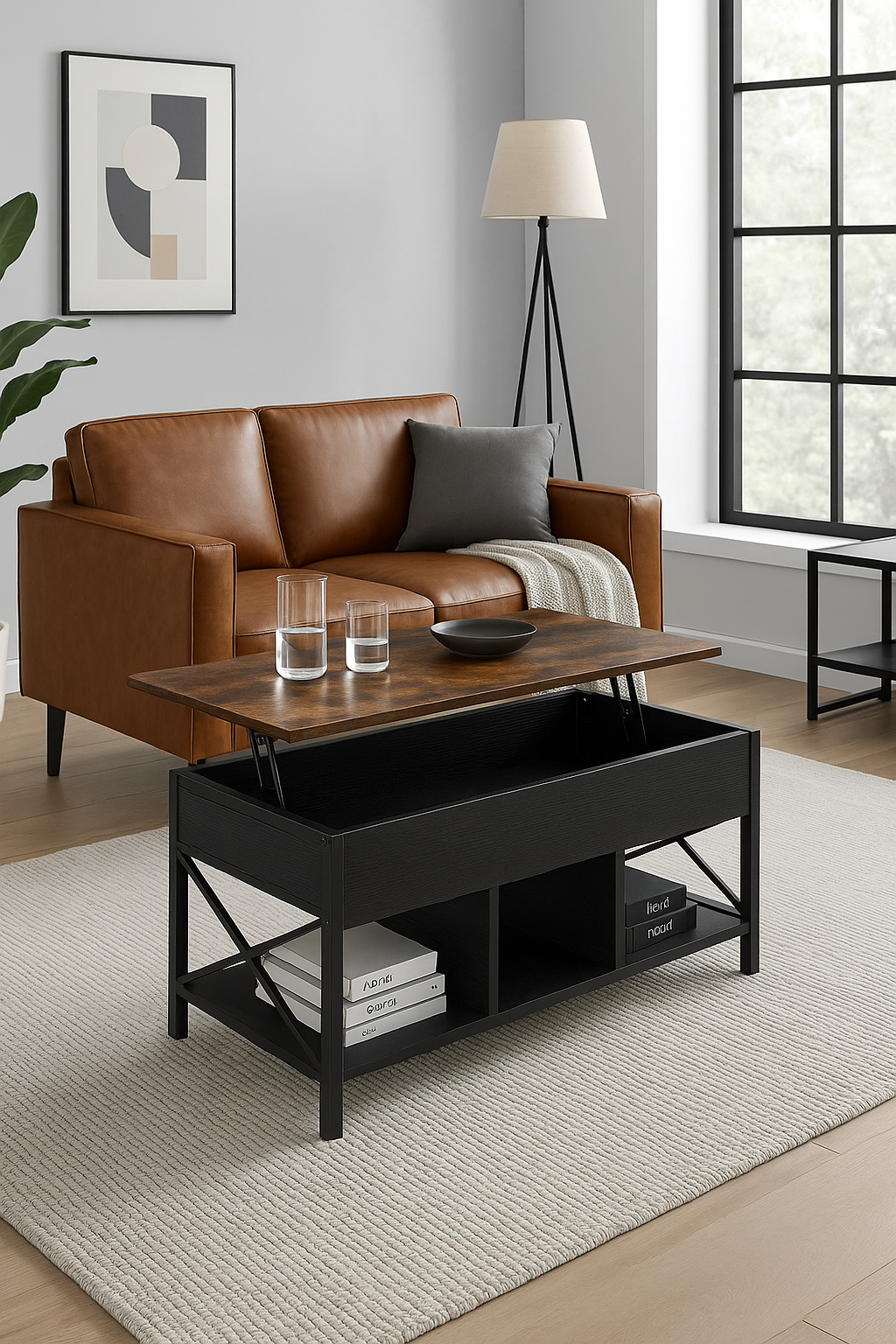 Add a new level of style and smart storage to your lounge with this Lift-Top Coffee Table with Storage. Perfect for modern living, this versatile table features a rich rustic wood finish and a sleek black metal frame, effortlessly blending industrial charm with contemporary design.