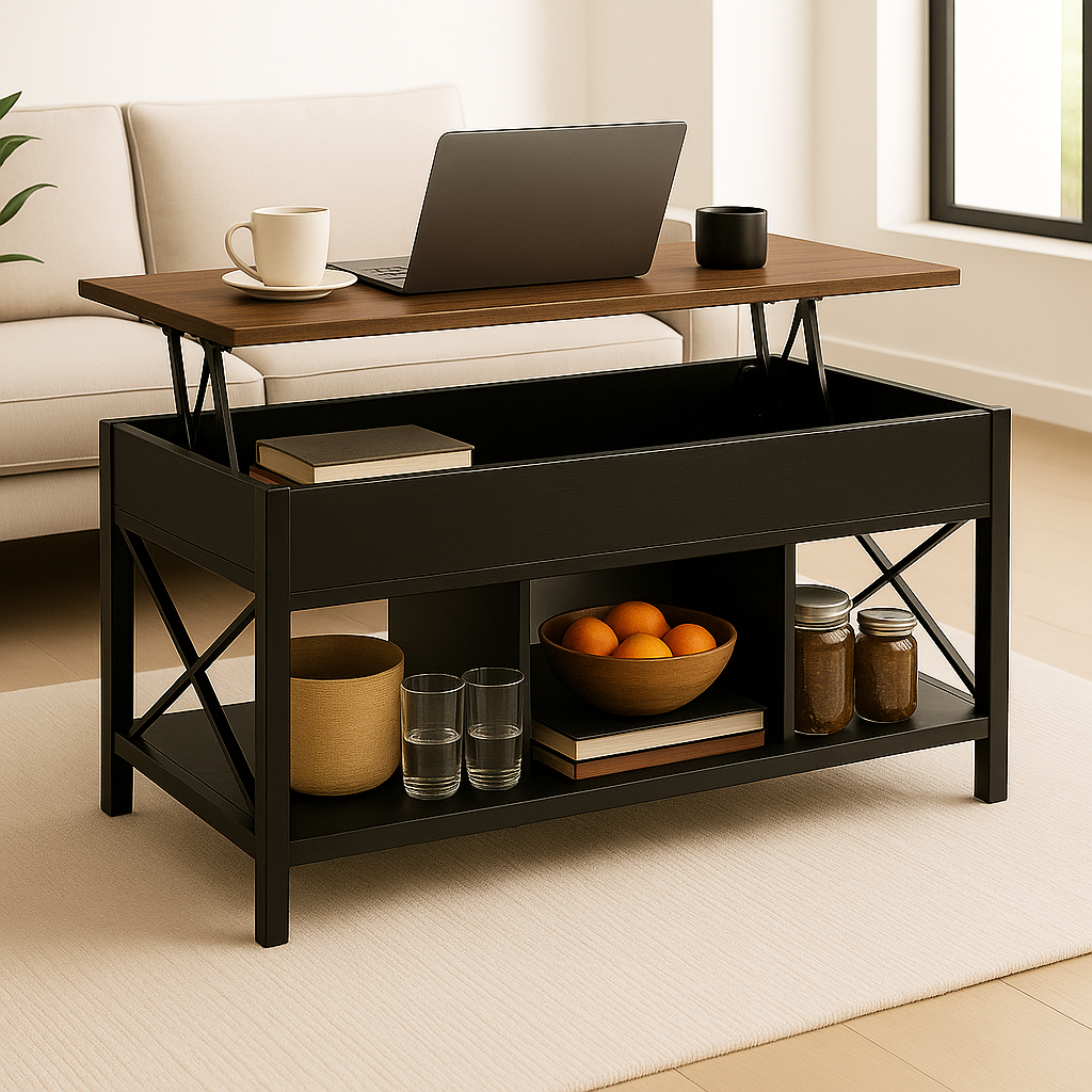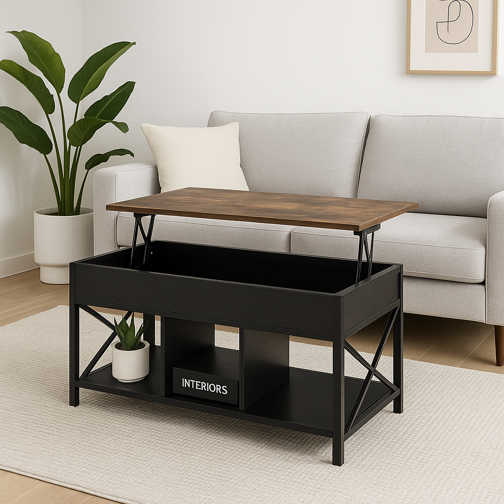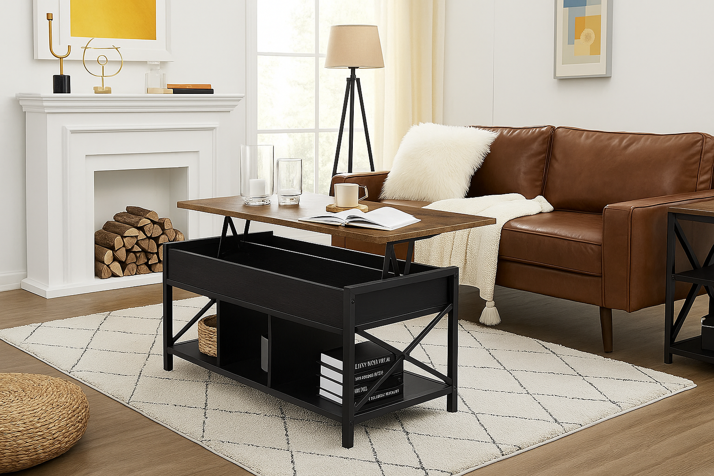 Add a new level of style and smart storage to your lounge with this Lift-Top Coffee Table with Storage. Perfect for modern living, this versatile table features a rich rustic wood finish and a sleek black metal frame, effortlessly blending industrial charm with contemporary design.