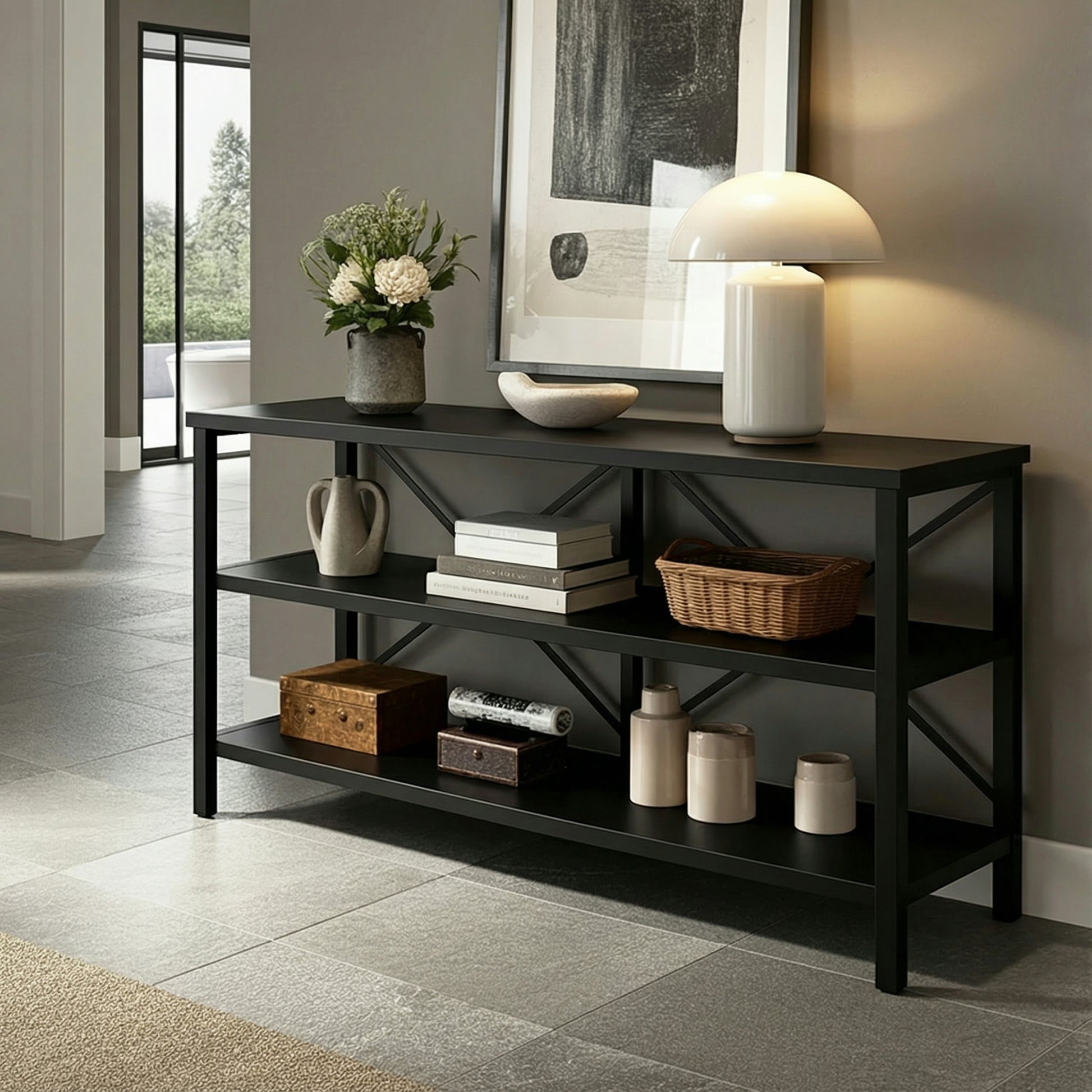 Bring a touch of effortless style to your home with this stunning black console table—a true centrepiece for any space. Finished in a sleek all-black colourway with a clean, modern silhouette, this three-tier unit perfectly balances contemporary edge with timeless charm, making it the ideal addition to your lounge, dining room, entryway, or hallway.