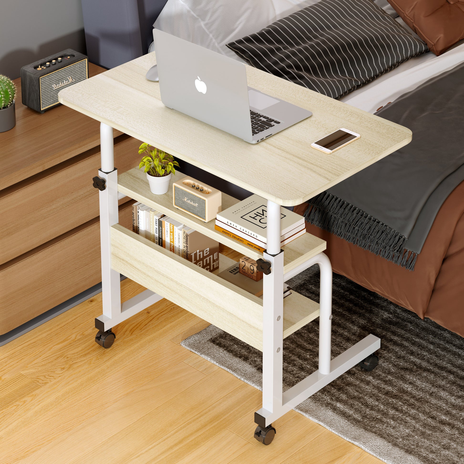Discover the perfect blend of style and functionality with our modern 2-tier sofa bed side table. This elegantly designed table is ideal for those seeking a smart storage solution without compromising on design. Crafted with a robust white steel frame and complemented by a chic MDF wooden top, it offers durability along with a sleek appearance. The compact structure is enhanced with multiple shelves that provide ample storage space, making it an excellent addition to your home or office. Equipped with four smooth-rolling wheels, this versatile piece can be easily moved around for optimal convenience. Whether used as a side table next to your sofa or bed, or as a mobile laptop desk, it adapts to your needs effortlessly.